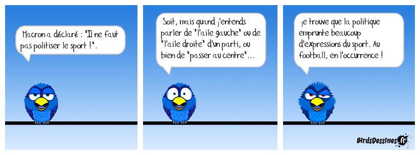 Case 1:Bird 1: Macron a déclaré : "Il ne faut pas politiser le sport !". | Case 2: Bird 1: Soit, mais quand j'entends parler de "l'aile gauche" ou de "l'aile droite" d'un parti, ou bien de "passer au centre"... | Case 3: Bird 1: je trouve que la politique emprunte beaucoup d'expressions du sport. Au football, en l'occurrence !