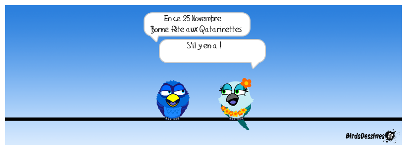 Case 1: | Case 2: Bird 1: En ce 25 Novembre Bonne fête aux Qatarinettes Bird 2: S'il y en a ! | Case 3: