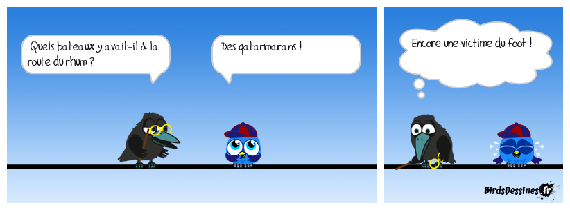 Case 1:Bird 1: Quels bateaux y avait-il à la route du rhum ? | Case 2: Bird 1: Des qatarmarans ! | Case 3: Bird 1: Encore une victime du foot !