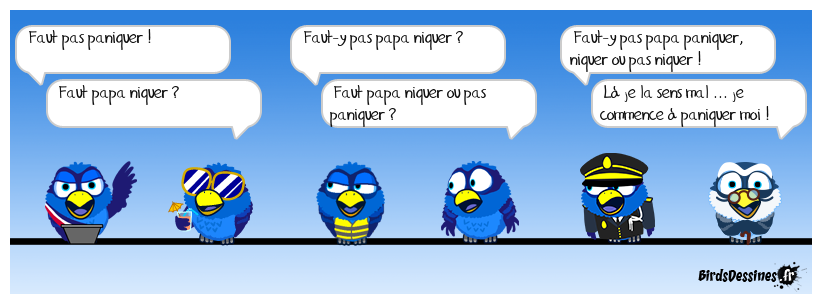 Case 1:Bird 1: Faut pas paniquer !Bird 2: Faut papa niquer ? | Case 2: Bird 1: Faut-y pas papa niquer ? Bird 2: Faut papa niquer ou pas paniquer ? | Case 3: Bird 1: Faut-y pas papa paniquer, niquer ou pas niquer ! Bird 2: Là je la sens mal ... je commence à paniquer moi !