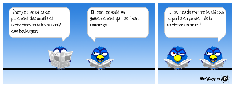 Case 1:Bird 1: Énergie : Un délai de paiement des impôts et cotisations sociales accordé aux boulangers. | Case 2: Bird 1: Eh ben, en voilà un gouvernement qu'il est bien. comme ça ..... | Case 3: Bird 1: ... au lieu de mettre la clé sous la porte en janvier, ils la mettront en mars !