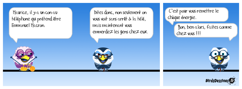Case 1:Bird 1: Maurice, il y a un con au téléphone qui prétend être Emmanuel Macron. | Case 2: Bird 1: Dites donc, non seulement on vous voit sans arrêt à la télé, mais maintenant vous emmerdez les gens chez eux. | Case 3: Bird 1: C’est pour vous remettre le chèque énergie. Bird 2: Bon, ben alors, faites comme chez vous !!!