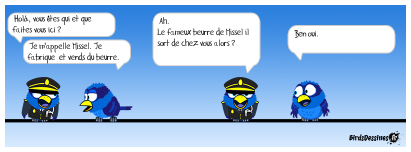 Case 1:Bird 1: Holà, vous êtes qui et que faites vous ici ? Bird 2: Je m'appelle Missel. Je fabrique et vends du beurre. | Case 2: Bird 1: Ah. Le fameux beurre de Missel il sort de chez vous alors ? | Case 3: Bird 1: Ben oui.