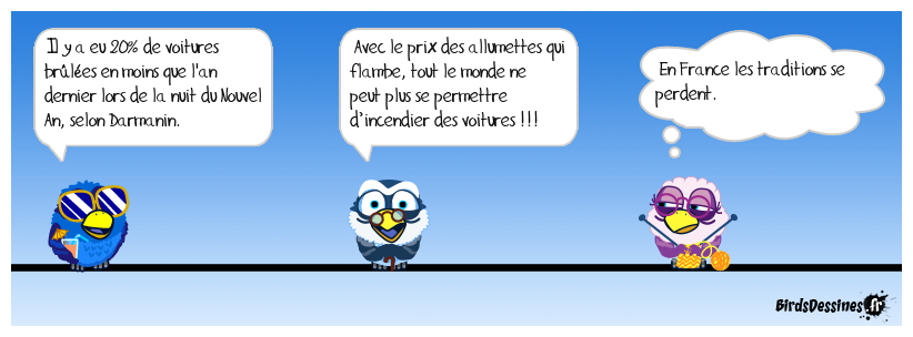 Case 1:Bird 1: Il y a eu 20% de voitures brûlées en moins que l'an dernier lors de la nuit du Nouvel An, selon Darmanin. | Case 2: Bird 1: Avec le prix des allumettes qui flambe, tout le monde ne peut plus se permettre d’incendier des voitures !!! | Case 3: Bird 1: En France les traditions se perdent.