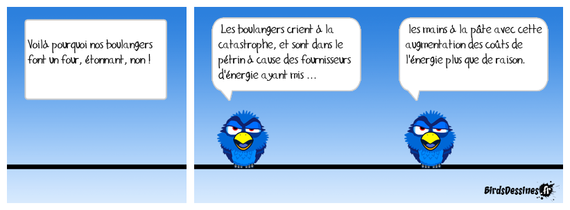 Case 1:Bird 1: Voilà pourquoi nos boulangers font un four, étonnant, non ! | Case 2: Bird 1: Les boulangers crient à la catastrophe, et sont dans le pétrin à cause des fournisseurs d'énergie ayant mis ... | Case 3: Bird 1: les mains à la pâte avec cette augmentation des coûts de l'énergie plus que de raison.