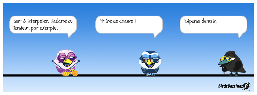Case 1:Bird 1: Sert à interpeler. Madame ou Monsieur, par exemple. | Case 2: Bird 1: Prière de chauve ! | Case 3: Bird 1: Réponse demain.