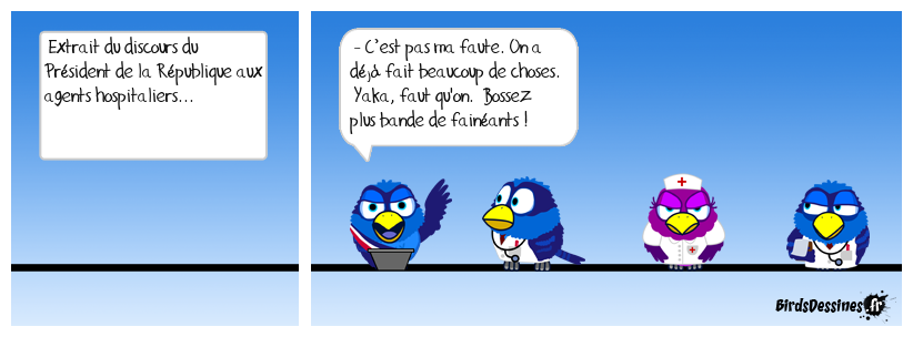 Case 1:Bird 1: Extrait du discours du Président de la République aux agents hospitaliers... | Case 2: Bird 1: - C’est pas ma faute. On a déjà fait beaucoup de choses. Yaka, faut qu'on. Bossez plus bande de fainéants ! | Case 3: