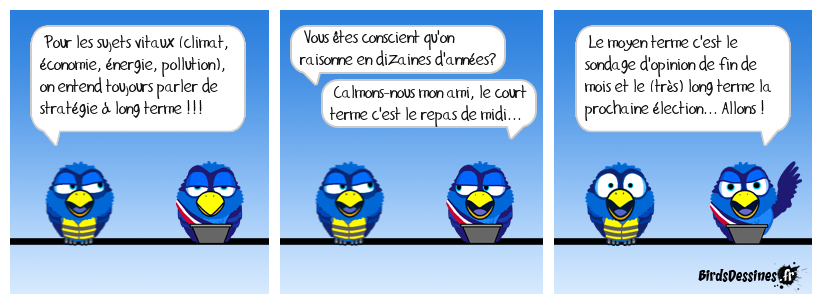 Case 1:Bird 1: Pour les sujets vitaux (climat, économie, énergie, pollution), on entend toujours parler de stratégie à long terme !!! | Case 2: Bird 1: Vous êtes conscient qu'on raisonne en dizaines d'années? Bird 2: Calmons-nous mon ami, le court terme c'est le repas de midi... | Case 3: Bird 1: Le moyen terme c'est le sondage d'opinion de fin de mois et le (très) long terme la prochaine élection... Allons !