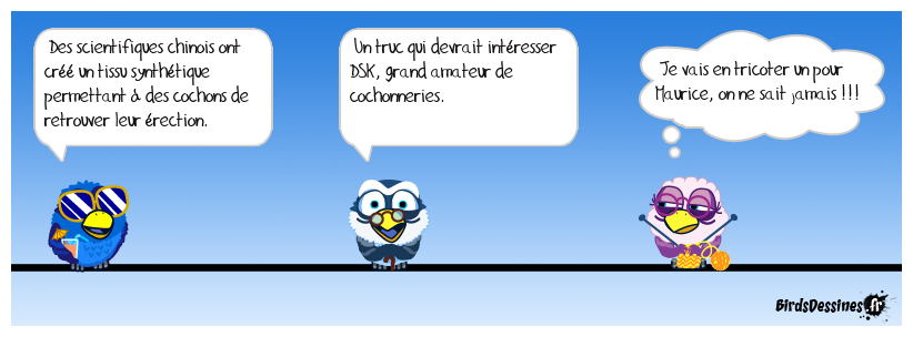Case 1:Bird 1: Des scientifiques chinois ont créé un tissu synthétique permettant à des cochons de retrouver leur érection. | Case 2: Bird 1: Un truc qui devrait intéresser DSK, grand amateur de cochonneries. | Case 3: Bird 1: Je vais en tricoter un pour Maurice, on ne sait jamais !!!