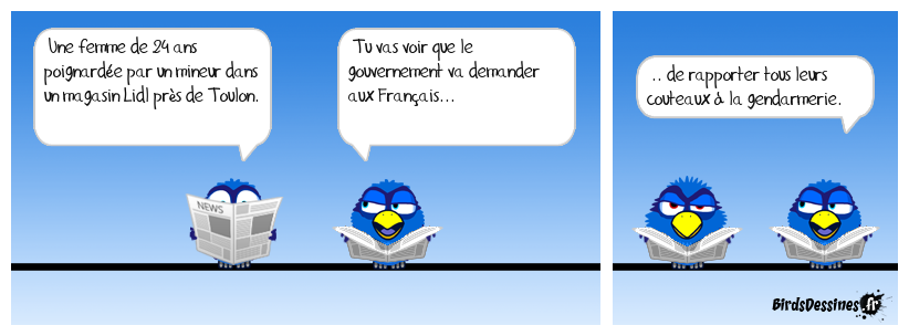 Case 1:Bird 1: Une femme de 24 ans poignardée par un mineur dans un magasin Lidl près de Toulon. | Case 2: Bird 1: Tu vas voir que le gouvernement va demander aux Français... | Case 3: Bird 1: .. de rapporter tous leurs couteaux à la gendarmerie.