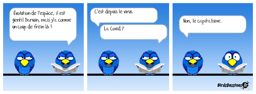 Case 1:Bird 1: Èvolution de l'espèce, il est gentil Darwin, mais y'a comme un coup de frein là ! | Case 2: Bird 1: C'est depuis le virus. Bird 2: La Covid ? | Case 3: Bird 1: Non, le capitalisme.