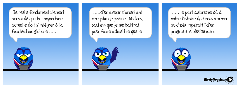 Case 1:Bird 1: Je reste fondamentalement persuadé que la conjoncture actuelle doit s’intégrer à la finalisation globale ..... | Case 2: Bird 1: .....d’un avenir s’orientant vers plus de justice. Dès lors, sachez que je me battrai pour faire admettre que le ..... | Case 3: Bird 1: ..... le particularisme dû à notre histoire doit nous amener au choix impératif d’un programme plus humain.