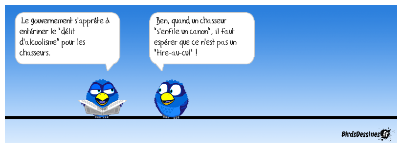 Case 1:Bird 1: Le gouvernement s'apprête à entériner le "délit d'alcoolisme" pour les chasseurs. | Case 2: Bird 1: Ben, quand un chasseur "s'enfile un canon", il faut espérer que ce n'est pas un "tire-au-cul" ! | Case 3: