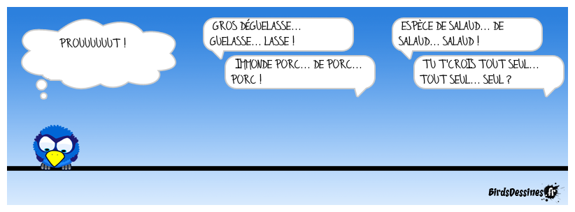 Case 1:Bird 1: PROUUUUUUT ! | Case 2: Bird 1: GROS DÈGUELASSE... GUELASSE... LASSE ! Bird 2: IMMONDE PORC... DE PORC... PORC ! | Case 3: Bird 1: ESPÉCE DE SALAUD... DE SALAUD... SALAUD ! Bird 2: TU T'CROIS TOUT SEUL... TOUT SEUL... SEUL ?