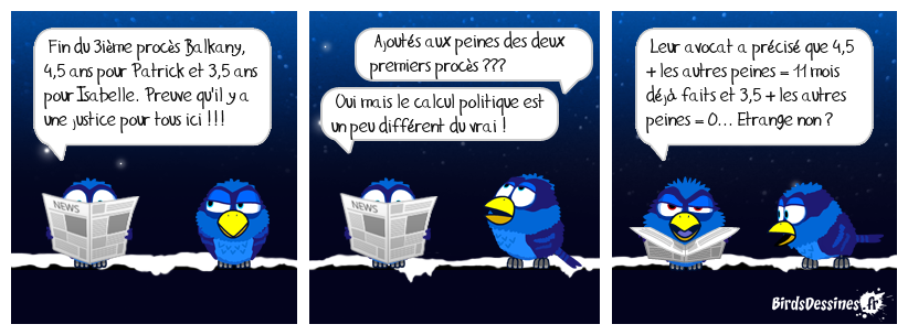 Case 1:Bird 1: Fin du 3ième procès Balkany, 4,5 ans pour Patrick et 3,5 ans pour Isabelle. Preuve qu'il y a une justice pour tous ici !!! | Case 2: Bird 1: Ajoutés aux peines des deux premiers procès ??? Bird 2: Oui mais le calcul politique est un peu différent du vrai ! | Case 3: Bird 1: Leur avocat a précisé que 4,5 + les autres peines = 11 mois déjà faits et 3,5 + les autres peines = 0... Etrange non ?