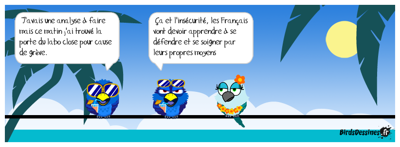 Case 1:Bird 1: J'avais une analyse à faire mais ce matin j'ai trouvé la porte du labo close pour cause de grève. | Case 2: Bird 1: Ça et l'insécurité, les Français vont devoir apprendre à se défendre et se soigner par leurs propres moyens | Case 3: Bird 1: ...