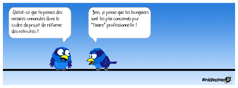 Case 1:Bird 1: Qu'est-ce que tu penses des mesures annoncées dans le cadre du projet de réforme des retraites ? | Case 2: Bird 1: Ben, je pense que les banquiers sont les plus concernés par "l'usure" professionnelle ! | Case 3: