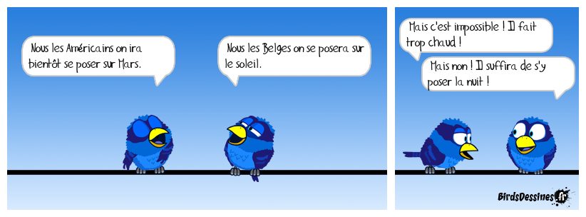 Case 1:Bird 1: Nous les Américains on ira bientôt se poser sur Mars. | Case 2: Bird 1: Nous les Belges on se posera sur le soleil. | Case 3: Bird 1: Mais c'est impossible ! Il fait trop chaud ! Bird 2: Mais non ! Il suffira de s'y poser la nuit !