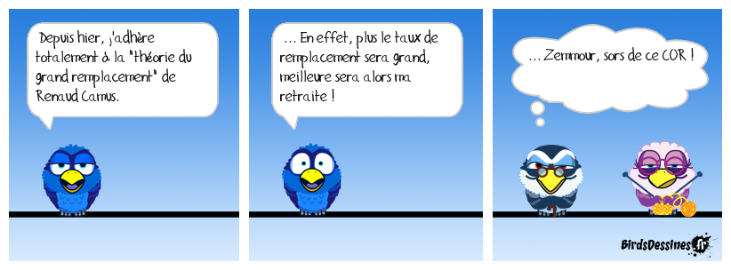 Case 1:Bird 1: Depuis hier, j'adhère totalement à la "théorie du grand remplacement" de Renaud Camus. | Case 2: Bird 1: ... En effet, plus le taux de remplacement sera grand, meilleure sera alors ma retraite ! | Case 3: Bird 1: ... Zemmour, sors de ce COR !