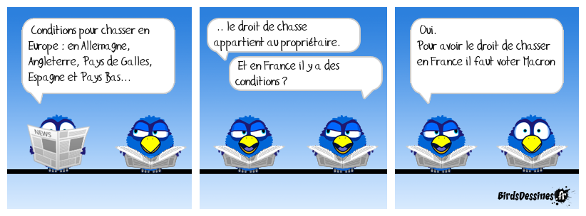 Case 1:Bird 1: Conditions pour chasser en Europe : en Allemagne, Angleterre, Pays de Galles, Espagne et Pays Bas... | Case 2: Bird 1: .. le droit de chasse appartient au propriétaire. Bird 2: Et en France il y a des conditions ? | Case 3: Bird 1: Oui. Pour avoir le droit de chasser en France il faut voter Macron