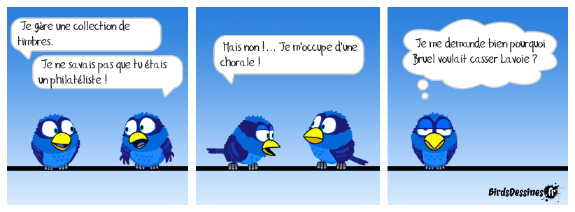 Case 1:Bird 1: Je gère une collection de timbres.Bird 2: Je ne savais pas que tu étais un philatéliste ! | Case 2: Bird 1: Mais non !... Je m'occupe d'une chorale ! | Case 3: Bird 1: Je me demande bien pourquoi Bruel voulait casser Lavoie ?