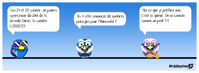 Case 1:Bird 1: Les 21 et 22 janvier, on pourra apercevoir du côté de la Grande Ourse, la comète C/2022 E3. | Case 2: Bird 1: Va-t-elle annoncer de sombres présages pour l’Humanité ? | Case 3: Bird 1: Moi ce que je préfère voir, c’est sa queue. On se console comme on peut !!!