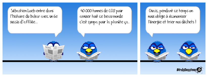 Case 1:Bird 1: Sébastien Loeb entre dans l’histoire du Dakar avec un 6e succès d’affilée.. | Case 2: Bird 1: 40 000 tonnes de CO2 pour amuser tout ce beau monde c'est sympa pour la planète ça. | Case 3: Bird 1: Ouais, pendant ce temps on nous oblige à économiser l'énergie et trier nos déchets !