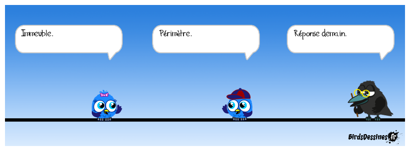 Case 1:Bird 1: Immeuble. | Case 2: Bird 1: Périmètre. | Case 3: Bird 1: Réponse demain.