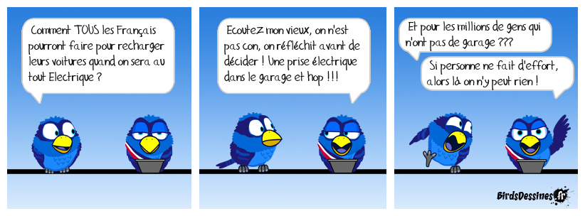 Case 1:Bird 1: Comment TOUS les Français pourront faire pour recharger leurs voitures quand on sera au tout Electrique ? | Case 2: Bird 1: Ecoutez mon vieux, on n'est pas con, on réfléchit avant de décider ! Une prise électrique dans le garage et hop !!! | Case 3: Bird 1: Et pour les millions de gens qui n'ont pas de garage ??? Bird 2: Si personne ne fait d'effort, alors là on n'y peut rien !