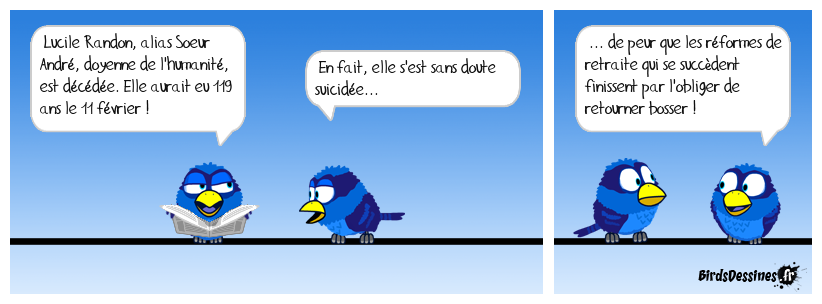 Case 1:Bird 1: Lucile Randon, alias Soeur André, doyenne de l'humanité, est décédée. Elle aurait eu 119 ans le 11 février ! | Case 2: Bird 1: En fait, elle s'est sans doute suicidée... | Case 3: Bird 1: ... de peur que les réformes de retraite qui se succèdent finissent par l'obliger de retourner bosser !