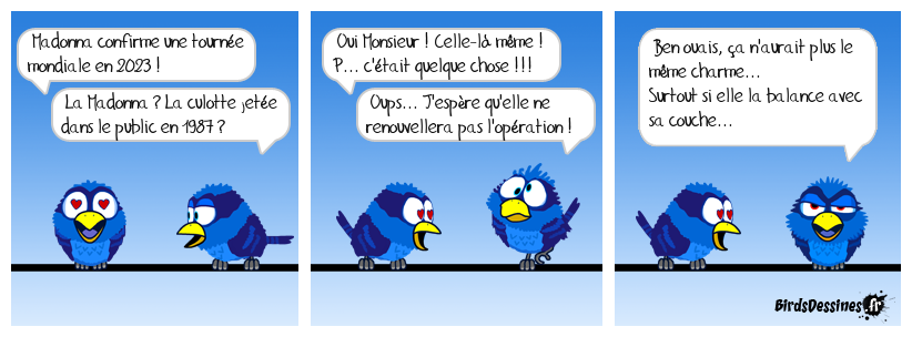 Case 1:Bird 1: Madonna confirme une tournée mondiale en 2023 !Bird 2: La Madonna ? La culotte jetée dans le public en 1987 ? | Case 2: Bird 1: Oui Monsieur ! Celle-là même ! P... c'était quelque chose !!! Bird 2: Oups... J'espère qu'elle ne renouvellera pas l'opération ! | Case 3: Bird 1: Ben ouais, ça n'aurait plus le même charme... Surtout si elle la balance avec sa couche...