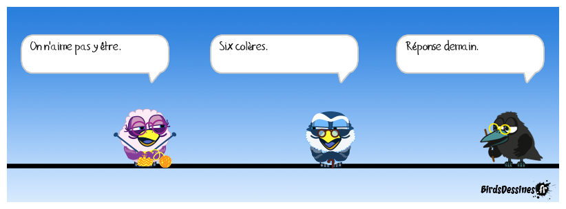 Case 1:Bird 1: On n'aime pas y être. | Case 2: Bird 1: Six colères. | Case 3: Bird 1: Réponse demain.