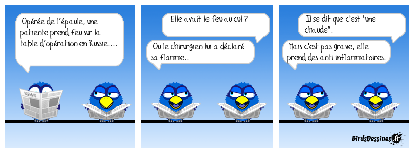 Case 1:Bird 1: Opérée de l’épaule, une patiente prend feu sur la table d’opération en Russie.... | Case 2: Bird 1: Elle avait le feu au cul ? Bird 2: Ou le chirurgien lui a déclaré sa flamme.. | Case 3: Bird 1: Il se dit que c'est "une chaude". Bird 2: Mais c'est pas grave, elle prend des anti inflammatoires.