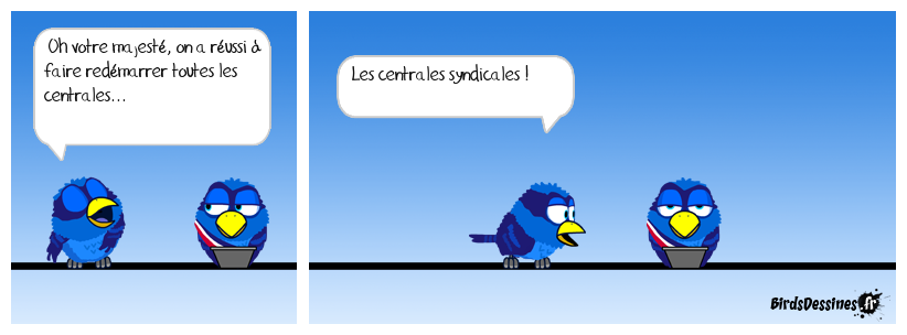 Case 1:Bird 1: Oh votre majesté, on a réussi à faire redémarrer toutes les centrales... | Case 2: Bird 1: Les centrales syndicales ! | Case 3: