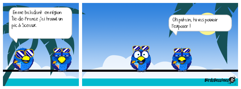 Case 1:Bird 1: En me baladant en région Île-de-France j'ai trouvé un pic à Sceaux. | Case 2: | Case 3: Bird 1: Oh putain, tu vas pouvoir l'exposer !