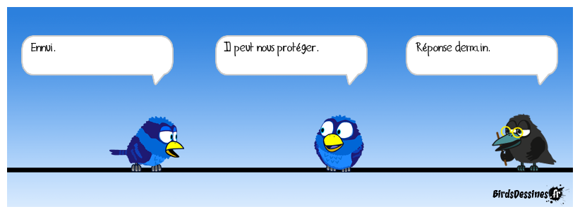 Case 1:Bird 1: Ennui. | Case 2: Bird 1: Il peut nous protéger. | Case 3: Bird 1: Réponse demain.