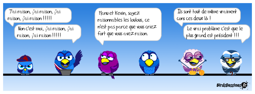 Case 1:Bird 1: J'ai raison, j'ai raison, j'ai raison, j'ai raison !!!!!Bird 2: Non c'est moi, j'ai raison, j'ai raison, j'ai raison !!!!! | Case 2: Bird 1: Manu et Kevin, soyez raisonnables les loulous, ce n'est pas parce que vous criez fort que vous avez raison. | Case 3: Bird 1: Ils sont tout de même vraiment cons ces deux là ! Bird 2: Le vrai problème c'est que le plus grand est président !!!