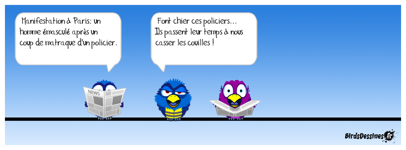 Case 1:Bird 1: Manifestation à Paris: un homme émasculé après un coup de matraque d'un policier. | Case 2: Bird 1: Font chier ces policiers... Ils passent leur temps à nous casser les couilles ! | Case 3: