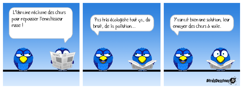Case 1:Bird 1: L'Ukraine réclame des chars pour repousser l'envahisseur russe ! | Case 2: Bird 1: Pas très écologiste tout ça, du bruit, de la pollution... | Case 3: Bird 1: Y'aurait bien une solution, leur envoyer des chars à voile.