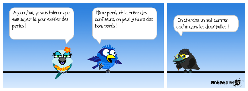 Case 1:Bird 1: Aujourd'hui, je vais tolérer que vous soyez là pour enfiler des perles ! | Case 2: Bird 1: Même pendant la trêve des confiseurs, on peut y faire des bons bonds ! | Case 3: Bird 1: On cherche un mot commun caché dans les deux bulles !