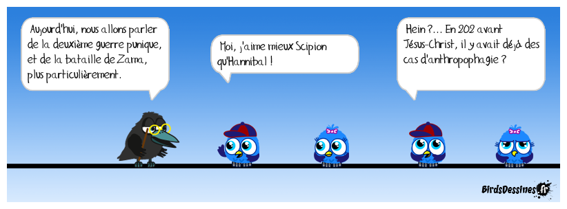 Case 1:Bird 1: Aujourd'hui, nous allons parler de la deuxième guerre punique, et de la bataille de Zama, plus particulièrement. | Case 2: Bird 1: Moi, j'aime mieux Scipion qu'Hannibal ! | Case 3: Bird 1: Hein ?... En 202 avant Jésus-Christ, il y avait déjà des cas d'anthropophagie ?