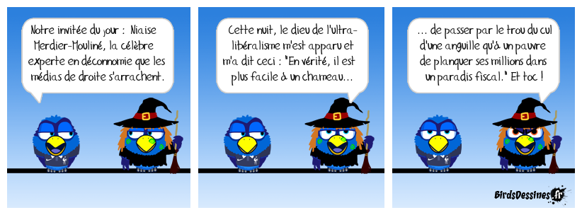 Case 1:Bird 1: Notre invitée du jour : Niaise Merdier-Mouliné, la célèbre experte en déconnomie que les médias de droite s'arrachent. | Case 2: Bird 1: Cette nuit, le dieu de l'ultra- libéralisme m'est apparu et m'a dit ceci : "En vérité, il est plus facile à un chameau... | Case 3: Bird 1: ... de passer par le trou du cul d'une anguille qu'à un pauvre de planquer ses millions dans un paradis fiscal." Et toc !