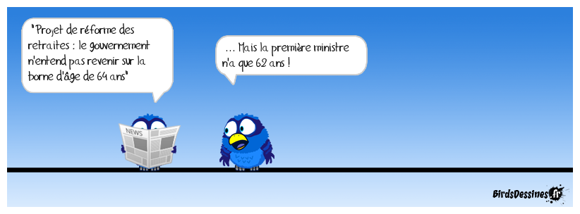 Case 1:Bird 1: "Projet de réforme des retraites : le gouvernement n'entend pas revenir sur la borne d'âge de 64 ans" | Case 2: Bird 1: ... Mais la première ministre n'a que 62 ans ! | Case 3: