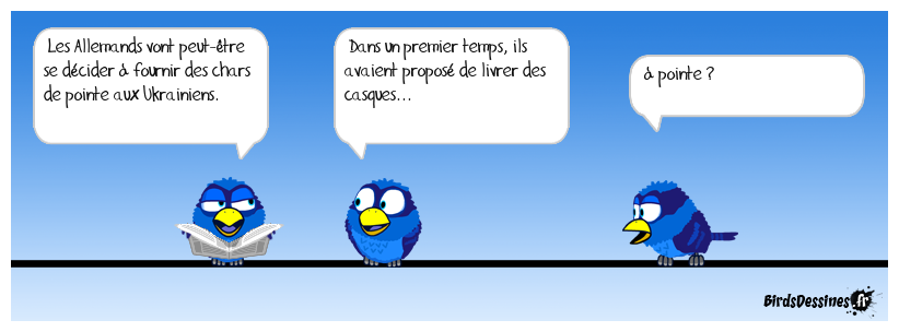 Case 1:Bird 1: Les Allemands vont peut-être se décider à fournir des chars de pointe aux Ukrainiens. | Case 2: Bird 1: Dans un premier temps, ils avaient proposé de livrer des casques... | Case 3: Bird 1: à pointe ?