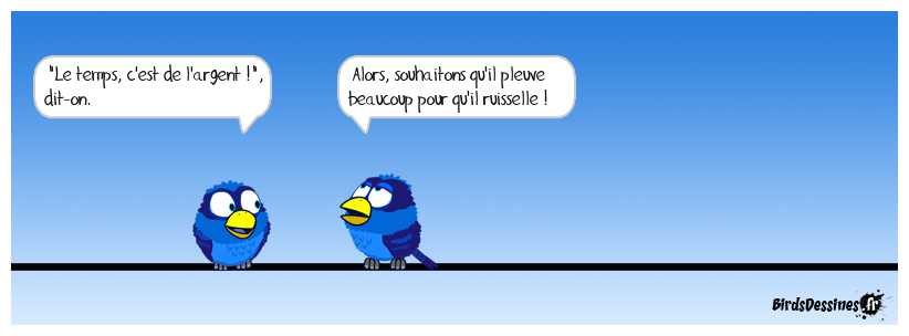 Case 1:Bird 1: "Le temps, c'est de l'argent !", dit-on. | Case 2: Bird 1: Alors, souhaitons qu'il pleuve beaucoup pour qu'il ruisselle ! | Case 3: