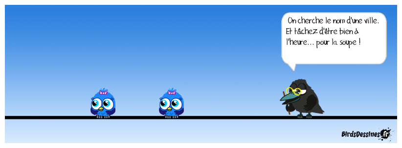 Case 1: | Case 2: | Case 3: Bird 1: On cherche le nom d'une ville. Et tâchez d'être bien à l'heure... pour la soupe !