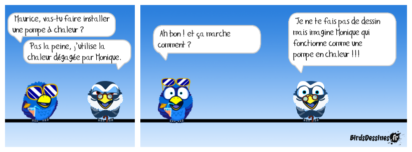Case 1:Bird 1: Maurice, vas-tu faire installer une pompe à chaleur ?Bird 2: Pas la peine, j’utilise la chaleur dégagée par Monique. | Case 2: Bird 1: Ah bon ! et ça marche comment ? | Case 3: Bird 1: Je ne te fais pas de dessin mais imagine Monique qui fonctionne comme une pompe en chaleur !!!