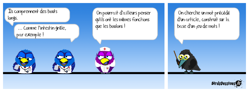 Case 1:Bird 1: Ils comprennent des bouts longs. Bird 2: ... Comme l'intestin grêle, par exemple ! | Case 2: Bird 1: On pourrait d'ailleurs penser qu'ils ont les mêmes fonctions que les boulons ! | Case 3: Bird 1: On cherche un mot précédé d'un article, construit sur la base d'un jeu de mots !