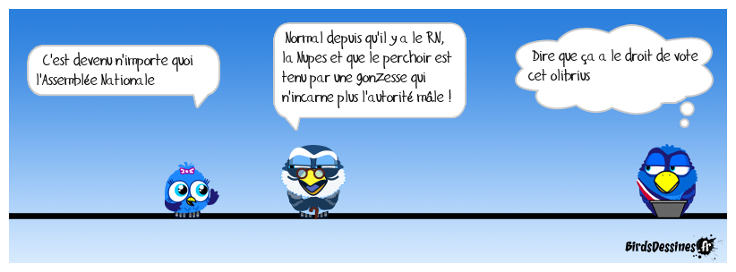 Case 1:Bird 1: C'est devenu n'importe quoi l'Assemblée Nationale | Case 2: Bird 1: Normal depuis qu'il y a le RN, la Nupes et que le perchoir est tenu par une gonzesse qui n'incarne plus l'autorité mâle ! | Case 3: Bird 1: Dire que ça a le droit de vote cet olibrius