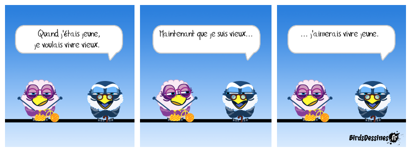 Case 1:Bird 1: Quand j'étais jeune, je voulais vivre vieux. | Case 2: Bird 1: Maintenant que je suis vieux... | Case 3: Bird 1: ... j'aimerais vivre jeune.